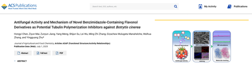 近日,南京农业大学朱映光教授团队以天然产物黄酮醇为骨架,设计并合成了一系列新型黄酮醇类衍生物,系统评估其抗植物病原真菌活性,并深入探讨其作用机制。相关研究以“Antifungal Activity and Mechanism of Novel Benzimidazole-Containing Flavonol Derivatives as Potential Tubulin Polymerization Inhibitors against Botrytis cinerea”为题,发表于农业综合国际权威期刊《Journal of Agricultural and Food Chemistry》。